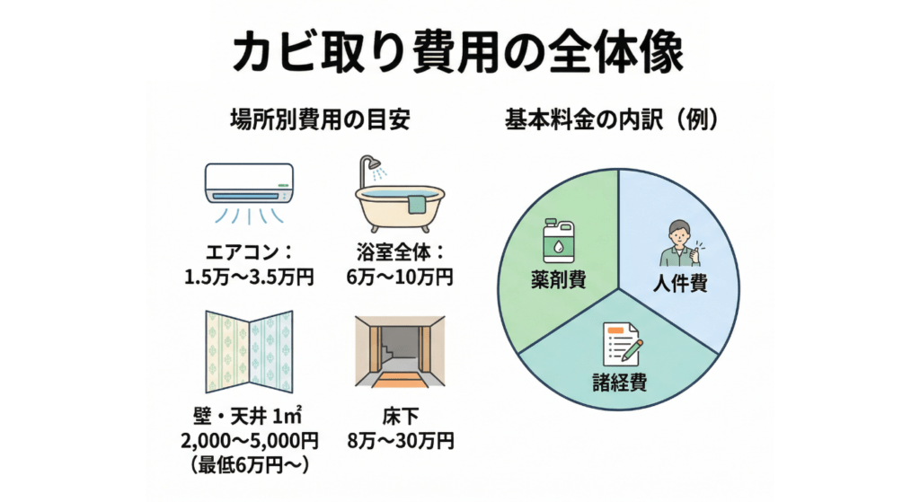 • 浴室・壁・エアコン・押入れ・床下など場所別のカビ取り費用相場