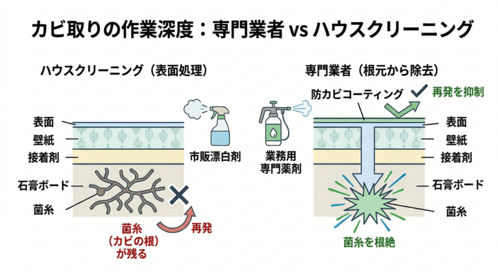 結論から言うと、やっていることの「深さ」がまったく違います。分かりやすく言えば、ハウスクリーニングが「雑草を地面の上で刈る」作業だとすれば、カビ取り専門業者は「根っこから引き抜く」作業です。この差が費用の違いに直結しています。