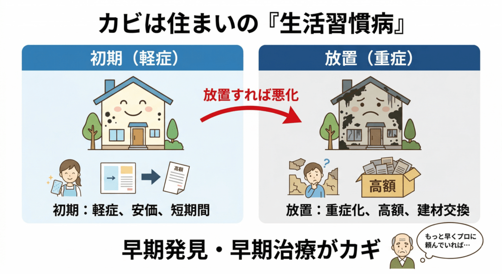 カビは家の「生活習慣病」です。 初期の段階できちんと対処すれば軽症で済むのに、放置すれば重症化して治療費が跳ね上がる。住まいのカビも、まったく同じです。